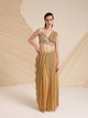 Our Rosario set in warm tones, pay homage to the eternal beauty of the saree. Richly adorned with big and small prints, gathered drape, and plunging V neckline, this outfit exudes an elegant yet sensuous look.